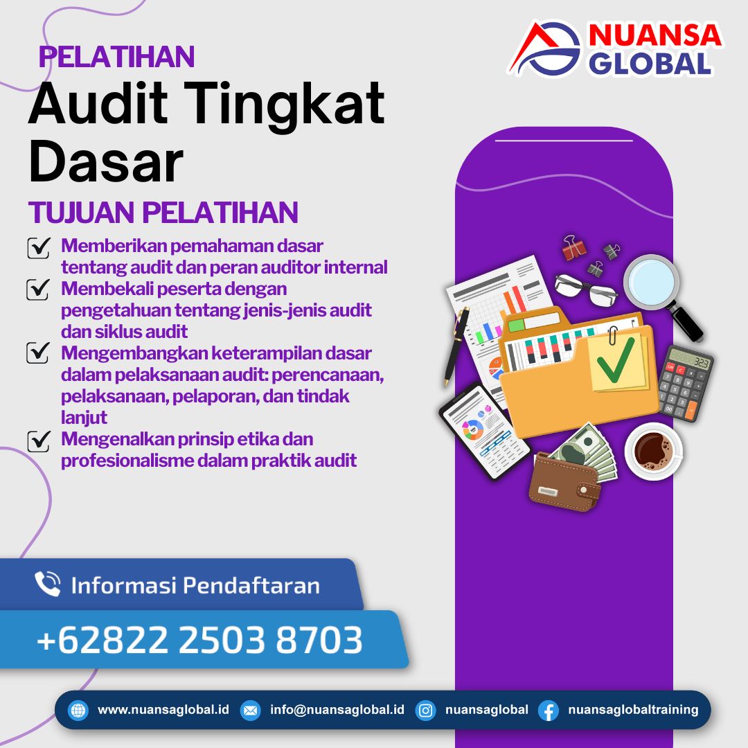 Pelatihan Audit Tingkat Dasar adalah program pelatihan yang dirancang untuk membekali peserta dengan pengetahuan dan keterampilan dasar dalam bidang audit, baik untuk keperluan internal pemerintahan maupun sektor swasta. Pelatihan ini memberikan pemahaman mendasar mengenai konsep audit, standar audit, tahapan pelaksanaan audit, teknik pengumpulan bukti audit, serta penyusunan laporan audit secara sistematis dan sesuai dengan regulasi yang berlaku.