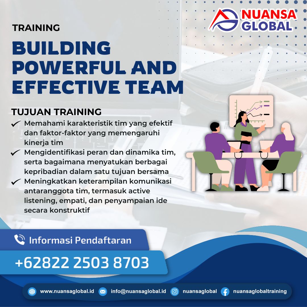 Pelatihan Building Powerful and Effective Team adalah program pelatihan yang dirancang untuk membantu peserta membangun tim yang produktif, harmonis, dan berfokus pada pencapaian tujuan bersama. Pelatihan ini memberikan keterampilan dan teknik yang dibutuhkan untuk mengelola dinamika tim, meningkatkan komunikasi, serta mengoptimalkan kinerja individu dalam kelompok.