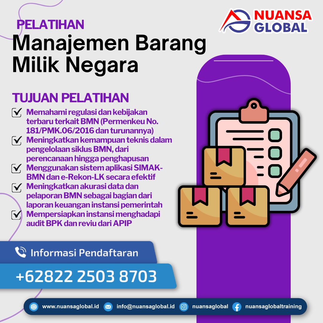 Pelatihan Manajemen Barang Milik Negara adalah Pelatihan yang bertujuan untuk membekali peserta dengan pemahaman dan keterampilan teknis dalam mengelola Barang Milik Negara secara akuntabel, tertib administrasi, dan sesuai dengan peraturan perundang-undangan yang berlaku. Pelatihan ini dirancang untuk aparatur sipil negara (ASN), pengelola keuangan, pengelola aset, serta pihak-pihak yang terlibat dalam pengelolaan BMN di instansi pemerintah.
