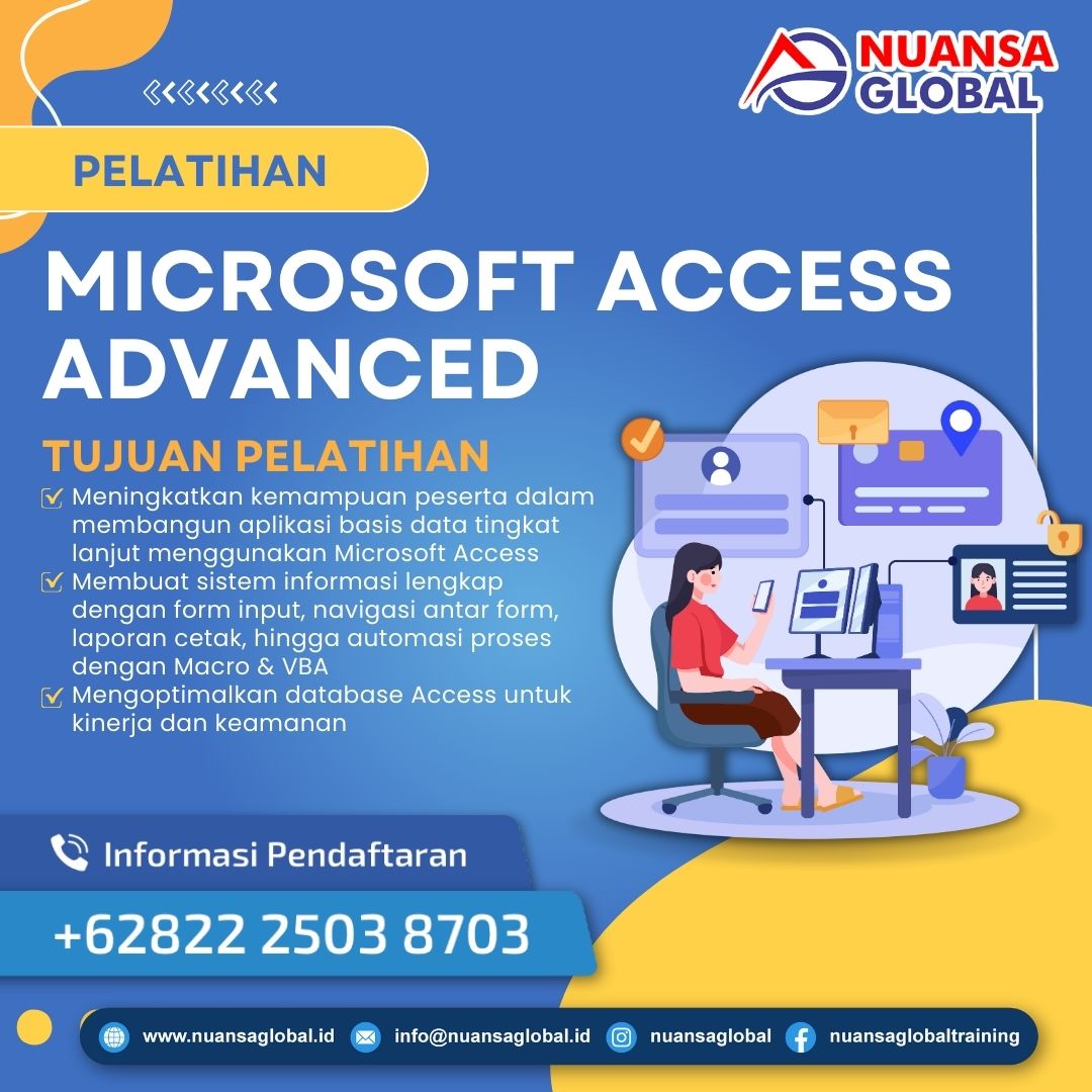 Pelatihan Microsoft Access Advanced adalah program pelatihan lanjutan yang dirancang untuk membantu peserta memahami dan menguasai teknik pengelolaan database tingkat lanjut menggunakan Microsoft Access. Program ini fokus pada pengembangan keterampilan dalam merancang, membangun, dan mengelola aplikasi database yang kompleks, sehingga peserta mampu mendukung proses pengolahan data secara efisien dan profesional di lingkungan kerja.