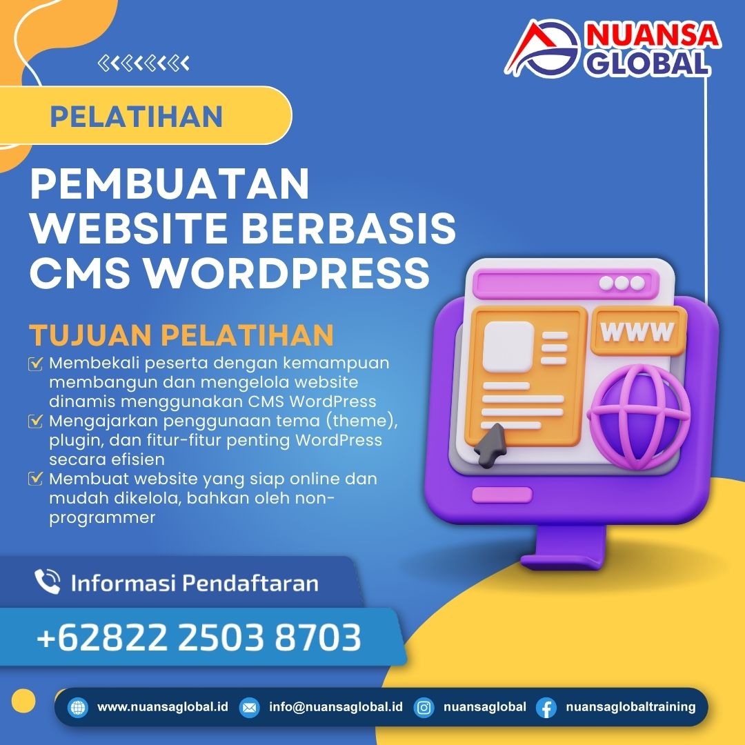 Pelatihan Pembuatan Website Berbasis CMS WordPress adalah program pelatihan yang bertujuan untuk membekali peserta dengan keterampilan praktis dalam merancang, membangun, dan mengelola website menggunakan platform CMS WordPress. Pelatihan ini cocok untuk pemula hingga tingkat menengah yang ingin menguasai cara membuat website profesional tanpa memerlukan keterampilan pengkodean yang rumit.