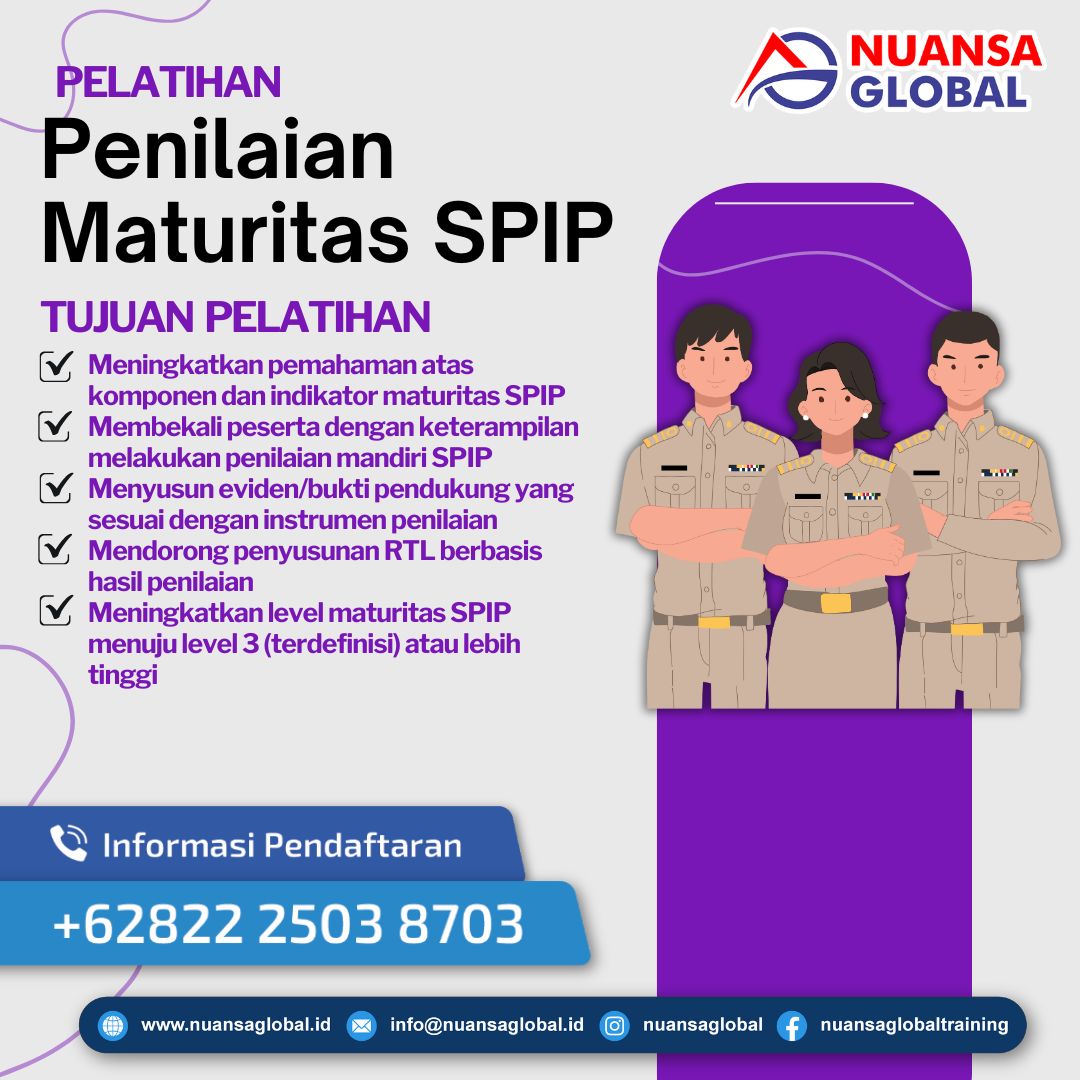 Pelatihan Penilaian Maturitas SPIP adalah program pelatihan yang bertujuan untuk meningkatkan pemahaman dan kemampuan aparatur pemerintah dalam melakukan penilaian maturitas Sistem Pengendalian Intern Pemerintah. Pelatihan ini dirancang berdasarkan pedoman BPKP dan peraturan perundangan, guna mendukung terciptanya tata kelola pemerintahan yang baik, akuntabel, dan bebas dari penyimpangan.